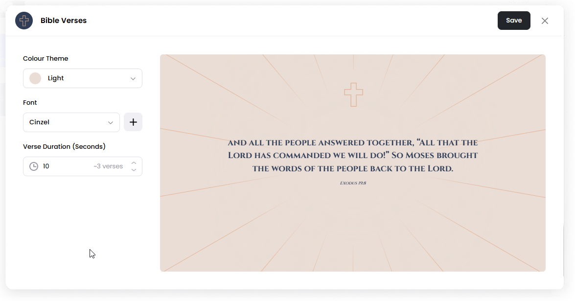 Verse Duration (Seconds): Set how long each verse appears before switching to the next verse.