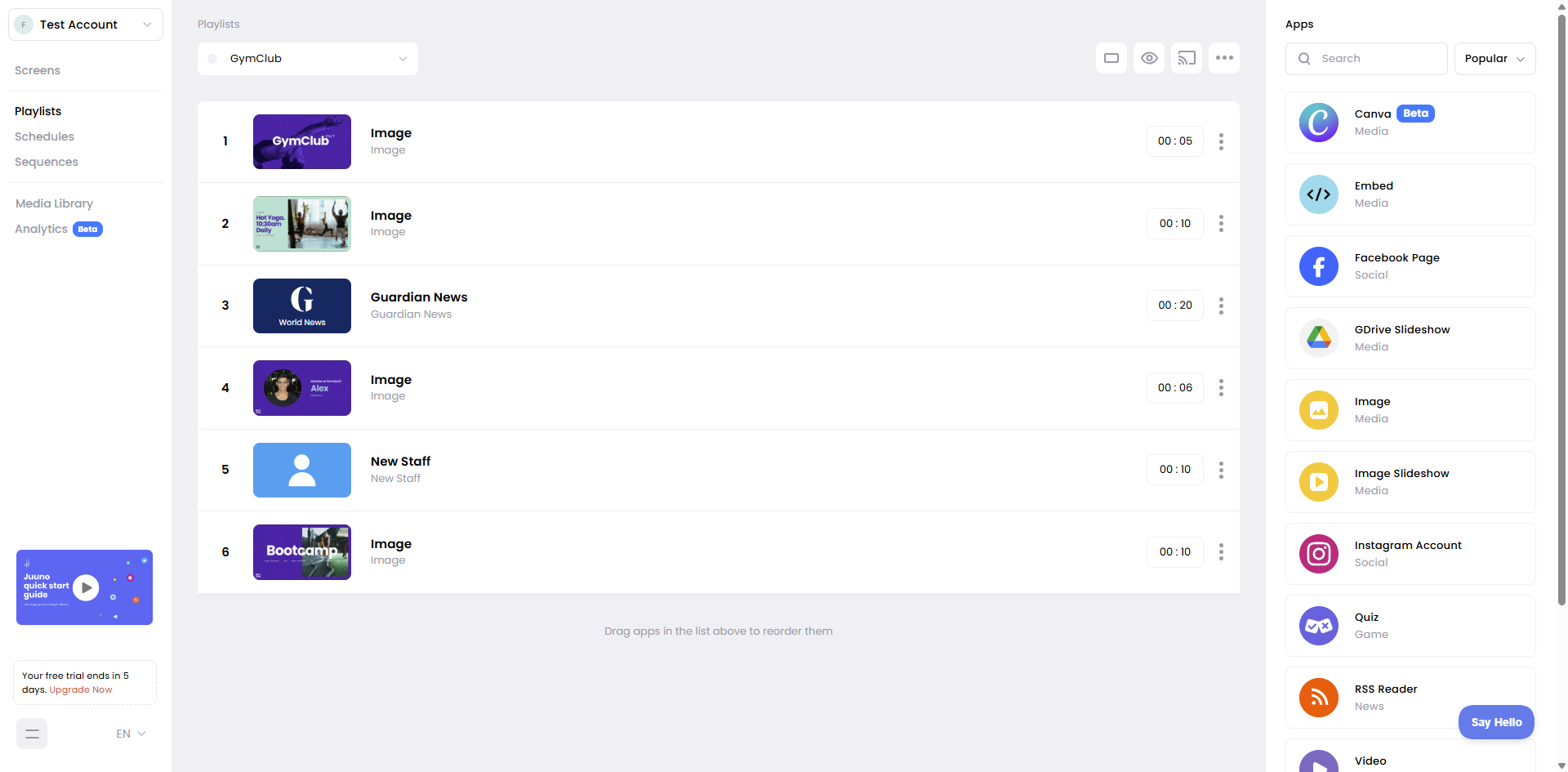 Add scenes to a playlist by choosing apps from Juuno's library—images, videos, social feeds, web embeds, and more. Drag scenes to reorder them, and set how long each one displays. When you cast a playlist to a screen, it loops continuously.