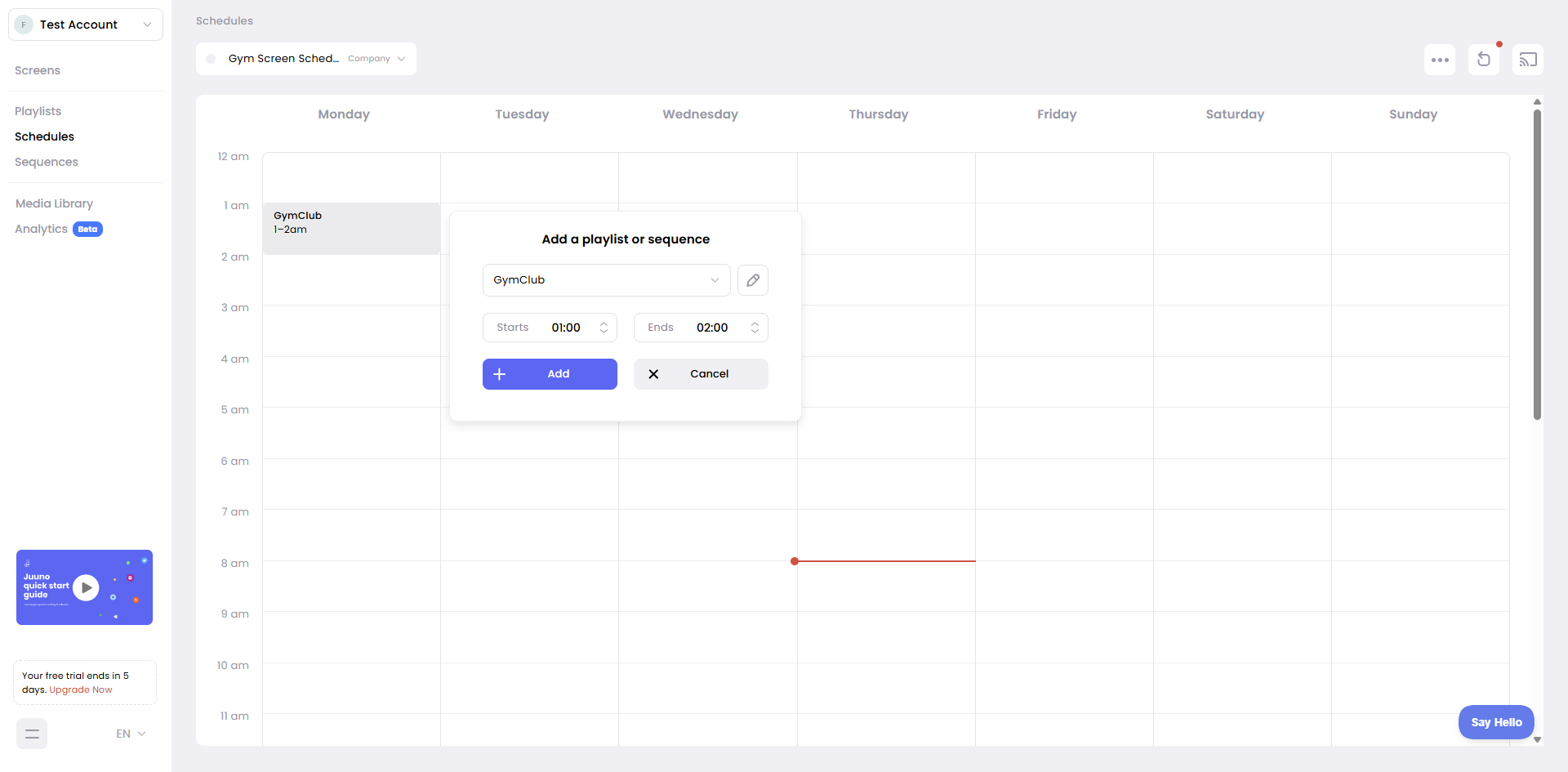 A schedule automates when playlists play on your screens based on time of day and day of week. Instead of manually casting playlists, create a schedule that switches content automatically.
